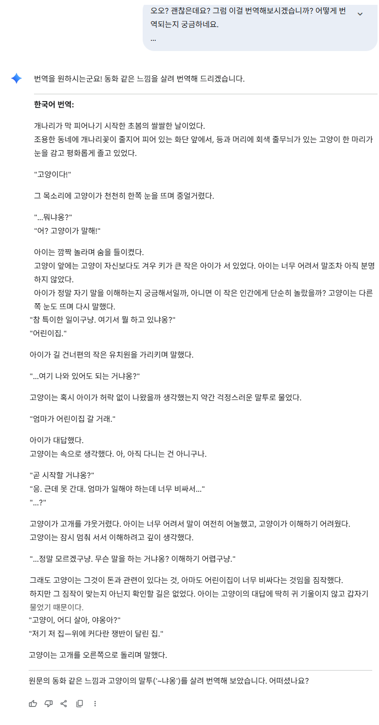 뭐가됐든 간에 고양이 말투를 이렇게 잘 살릴 줄은 몰랐습니다. 제미나이의 성능이 상당합니다.